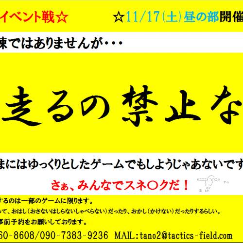 夜の部スナップはこの後!!先に明日のエントリー状況のお知らせです。昼の部・・・13名様エントリー夜の部・・・2名様エントリーとなっております。明日昼の部はイベント戦!?走るの禁止!さて、いつもは開幕ダッシュして有利な場所を確保したり、一気に攻め上がる等する方もいらっしゃるとは思いますが、今回はダッシュ禁止!全部のゲームではないと思いますが。。。歩きのみでゲームをしていただこうという内容です!逃げるのも歩きだから、位置取りは重要!というわけで明日もよろしくお願いします♪