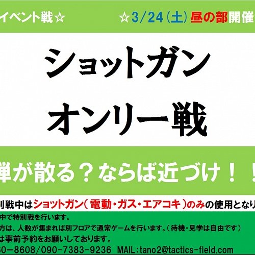 #福岡サバゲー #サバゲー #サバゲー装備 #サバゲー女子 おはようございます。本日も晴天なり!!いいサバゲー日和かと♪さて、本日の昼の部は一部のゲームをショットガンで行きたいと・・・・集まり次第ですが、していきたいと思っておるところですが(笑)本日のエントリー状況ですが、昼の部・・・18名エントリー夜の部・・・11名エントリーとなっております。それでは、本日のご予約・ご来店お待ちしております!☆★☆★☆★☆★☆★☆★☆★☆★☆★☆★☆★☆★☆★☆★☆★☆★TACTICS FIELD【多目的イン...