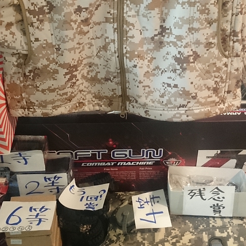 9月22日(火)当日限定で¥1000-くじ引き大会を開催致します!!(^^)/なんと今回はショップも大赤字覚悟の大放出!!!!気になる内容を紹介致します!!まずは...残念賞バトルフィールドのゲームでもおなじみのEAさんのドッグタグになります。次は...「もう1回?」賞☆パラコードブレスレッド☆次は...6等賞☆フェイスペイント(3色入り)☆次は...5等賞☆SⅡS0.2gBB弾(5000発入り)☆次は..4等賞☆リュックタイプの水筒☆※色の指定はできません。次は...3等賞☆冬用ウェアー上下セ...