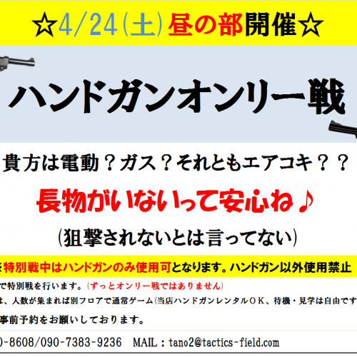 おはようございます!本日のエントリー状況ですが、昼の部・・・4名様夜の部・・・エントリー無しとなっております。昼の部はエアコキ戦!4人でエアコキ戦はフィールド制限しないときつそう・・・?エアコキはハンドガンでも1挺持っておくと練習その他諸々に使えていいですよ♪それでは本日も1日よろしくお願いします!