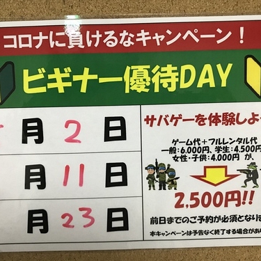 おはようございます!本日のエントリー状況ですが、昼の部・・・31名様夜の部・・・エントリー無しとなっております。本日はビギナー戦!・ゲーム代・エアガン・フルフェイスマスク・BB弾がまるごと入ったフルレンタルセットが通常6,000円(一般料金)のところなんと2,500円!!さらに初心者は初心者同士でゲームしましょうね!ってグループ分けをしますので、初めての方でもとっても入りやすい日となっております♪それでは本日も1日よろしくお願いします!
