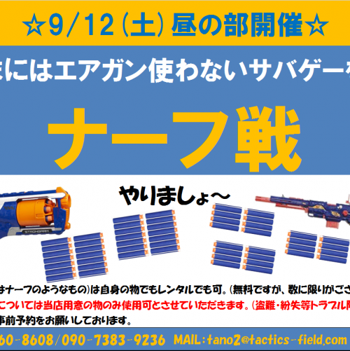 2020-09-11 ☆本日はお疲れ様でした☆明日のエントリー状況のお知らせ☆イベント お疲れ様でした!明日のエントリー状況ですが、昼の部・・・11名様夜の部・・・5名様+1グループ様貸切となっております。明日昼の部はナーフ戦!持ってる人は自分のを、持ってない人はこちらからお貸しするので、みんなナーフで遊ぼうぜ!!っ的な。弾に関しては、ごっちゃになったらいけないので当店からのレンタルとなります。当然レンタル料はかかりません。っ全部じゃなくて1クール分約30分程度をナーフ戦としますので、いつも使ってるガンももちろん持ってきてくださいね!それではまた明日! (続きを読む)