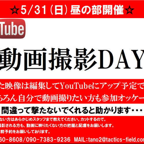 2020-05-31 ☆おはようございます☆本日のエントリー状況☆イベント おはようございます!本日のエントリー状況ですが、昼の部・・・29名様夜の部・・・エントリー無しとなっております。昼の部はYoutube動画撮影DAY!!一人称視点も三人称視点もガンガン撮っていこうと思っております☆映りたい方、支店提供してくれる方はガンガンアピールしてくださいね!後日編集してアップします。当然ながら、動きのある視点の方が面白くなりやすく、動画にしやすいです♪逆に映りたくない方や、映っててサバゲーしてるのがバレたらマジでまずい方等いらっしゃいましたら、スタッフに教えてください。配慮... (続きを読む)