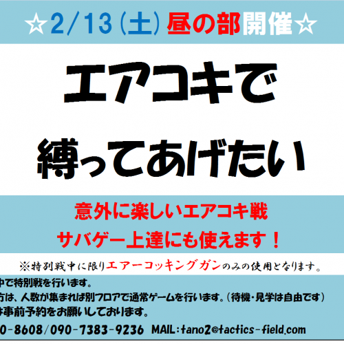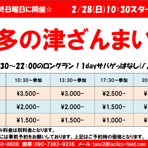 おはようございます。本日のエントリー状況ですが、昼の部・・・満員御礼夜の部・・・エントリー無しとなっております。本日昼の部はビギナー&親子優待DAY!!フルレンタルが超お得!&親子参加でちょっとお得となっております♪本日はビギナーさんも親子参加も結構いらっしゃいますので、ビギナー戦いい感じにできるんじゃないでしょうか。ビギナーさん連れてきてくれた経験者さんは、ビギナー親子グループ、経験者グループどちらに参加しても構いませんが、ビギナーグループで参加する場合は、ビギナー戦を一緒に盛り上げる役になっ...