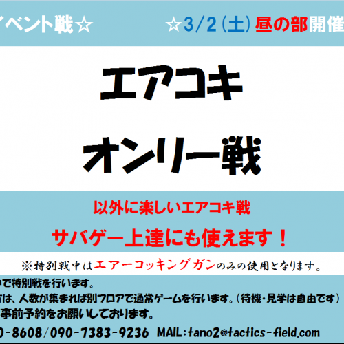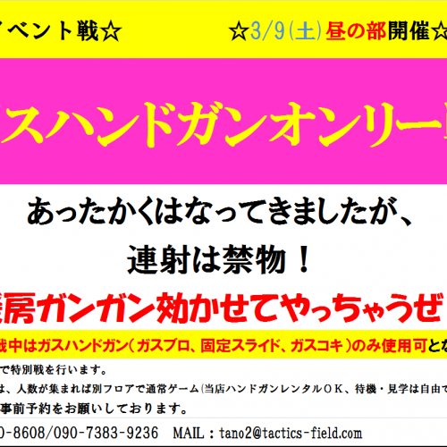 本日もえいこらさっさと準備中です!そんな本日のエントリー状況ですが、昼の部・・・21名様エントリー夜の部・・・7名様エントリーとなっております。昼の部はこれをしたい!ショットガン戦!エアコキもガスも電動も!?ガチャガチャしていきましょう☆まぁ3タップ制なので、ラピッドファイアも3回までなんですけども。それでは本日も1日よろしくお願いします☆そういえば、マルゼンのM1100ブラックストック(排莢式のやつ)が問屋にまだ在庫有るよ~って案内来てたなぁ