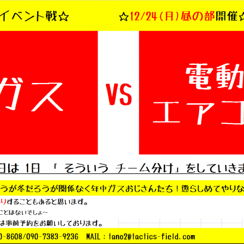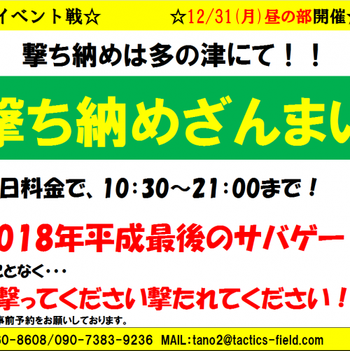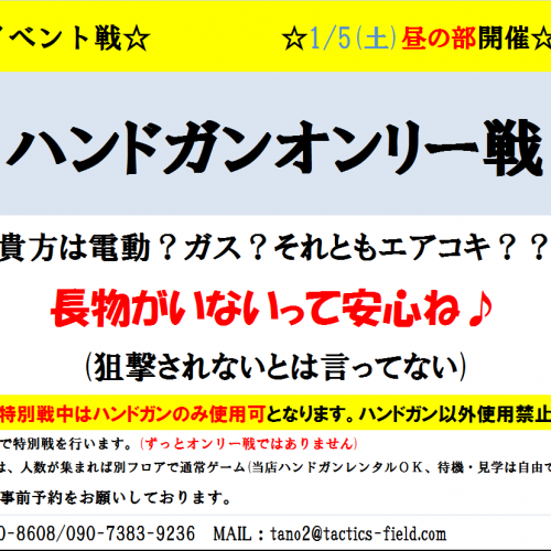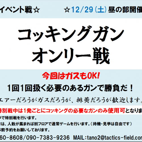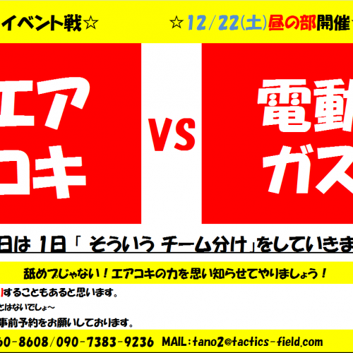 さて、現在開店準備中でございます。。。本日のエントリー状況ですが、昼の部・・・13名様エントリー夜の部・・・1名様エントリーとなっております。なお、本日から3日連続武器縛り!最初はこれ!エアコキ VS 電動&ガスガン戦!チームをエアコキオンリーチームvs電動&ガスオンリー(エアコキ禁止)チームで行っていきます。もちろん、どっちも持っている方は、気が変わればチーム移動も可能です!エアコキだからってなめんなよ!!ってところが見たいです☆もちろんサブウエポンも同じ感じですからね!それでは本日も1日よろ... (続きを読む)