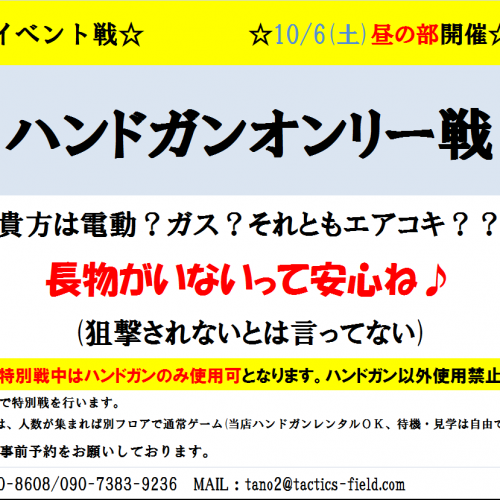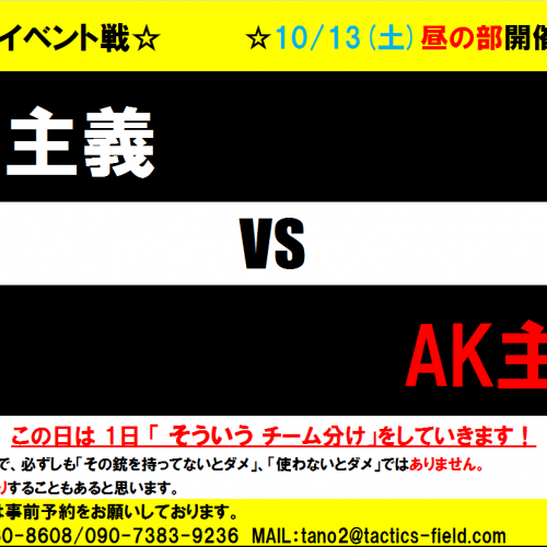 おはようございます!さてー日は出てるのに風は冷たいなー首回りとかそろそろ防寒しなきゃかなーてなところではありますが、徒歩になったら暑いんだよなーむずかしいなーだるねよとかね。そんな本日のエントリー状況ですが、昼の部・・・20名様エントリー夜の部・・・17名様エントリーとなっております。夜の部はハイレベルなゲームになりそう?また昼の部はイベント戦M4派vsAK派をやっていきます☆そういったチーム分けをしていきますので、説得、浮気は自由となっております。もちろんどっちかというとAK派だけどAK持って...