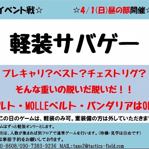おはようございます!本日も営業開始です☆最近あったかくなってきたので、もう夜でもマフラーだの手袋だのは必要なくなりました!原付でも黄砂が・・・?だそうなので、油断はできませんけども。さて、本日のエントリー状況ですが、昼の部・・・20名様エントリー夜の部・・・5F6F通常ゲームエントリーなし受付中 4F貸切となっております。本日昼の部は軽装サバゲー!ということで、最初のゲームだけは、重めの装備も可としますが、2,3,4ゲーム目はプレートキャリアベストチェストリグといった装備を禁止します!軽...
