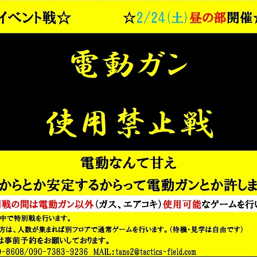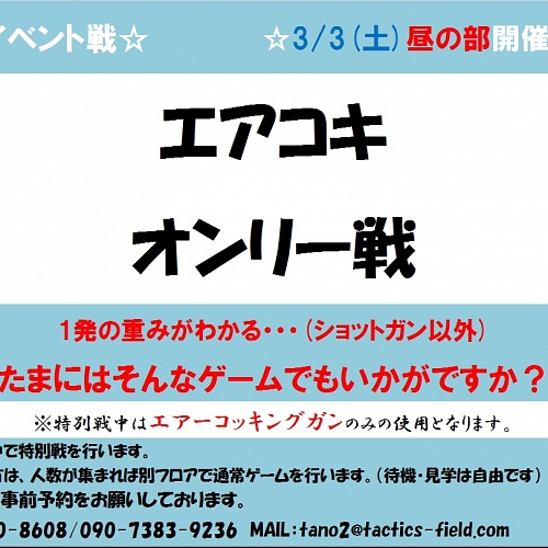 3月イベント一覧です☆3/3(土)昼の部開催エアコキオンリー戦!↑終了しました。3/10(土)昼の部開催電動ガン使用禁止戦!311(日)昼の部開催親子サバゲー!親子でエントリーの場合、お子様分の料金(中学生以下に限り)500円引き!3/17(土)昼の部開催エアコキ・10才以上用ガンオンリー戦!(初)エアコキは18才以上用ガン使用可(ただしショットガンは使用不可)また、10才以上用ガンでも、ミニ電動ガンは使用不可とします(フルオートオンリーなので)3/18(日)昼の部開催新人戦!フルレン...