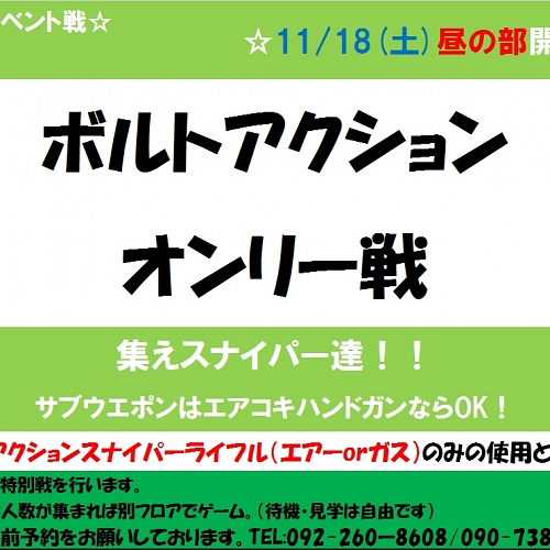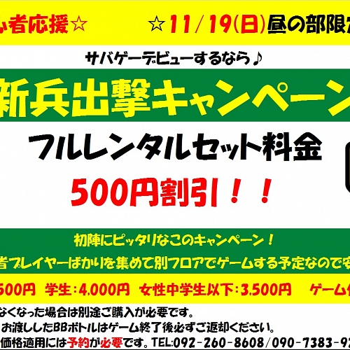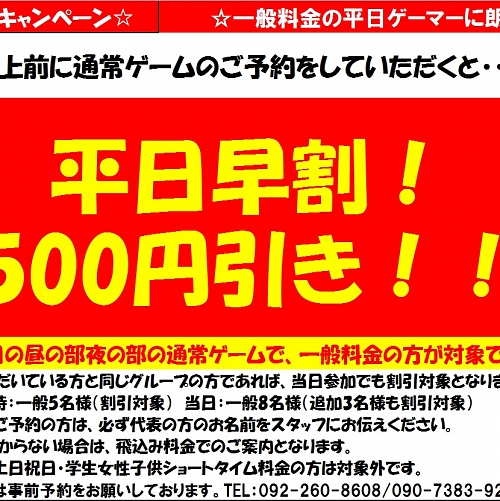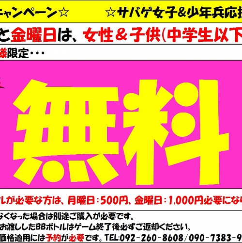 以前に実施していた女性無料キャンペーン再び!!月曜日と金曜日に限り、女性のゲーム料金が無料のキャンペーンを行っております!ゲーム代が無料ですし、フルレンタルされる方も通常3,000円頂いているところを、月曜日は500円ワンコイ~ン!金曜日は1,000円とレンタル料ですら割引を行っております!今がチャンスでーす!ご利用には要予約であり、先着順で限りがある為、早めのご予約を検討されてください!他にも他にも・・・平日早割も行っております。当フィールドは、今月31日(各店休日有の為、HPのカレンダー参照...