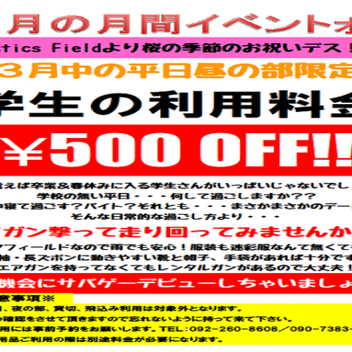 現在配信中の4月のLINE@のクーポンです☆今月は・・・『マスク・ゴーグル10%OFF!!』マスクやゴーグル購入時にご提示頂くと、そのお会計の際に、店頭価格よりさらに10%OFFさせて頂きます☆4月いっぱいの期間限定クーポンになりますのでお見逃しなく☆☆★☆★☆★☆★☆★☆★☆★☆★☆★☆★☆★☆★☆★☆★☆★☆★TACTICS FIELD【多目的インドアサバイバルゲームフィールド】住所 【〒813-0034 福岡県福岡市東区多の津4-5-12 LIZビル3F】TEL【092-260-8608】...