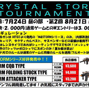昨日の昼の部に『CRYSTAL STORM TOURNAMENT』開催しました☆基本ルールは通常のサバゲーと同じですが・・・・使用するのはHITECより発売中の『M4STORM』のみ!!・プレキャリ、ベストなどの装備類は一切禁止!!・ゴーグルはレンズタイプのみ!というルールでプレーをしていただきました☆当フィールドで初めての開催でしたが、非常に盛り上がりました( *´艸`)参加総数は7名という少人数だったので、フィールド内を縦横無尽にかけまわっていただきました☆1ゲームの平均進行時間...