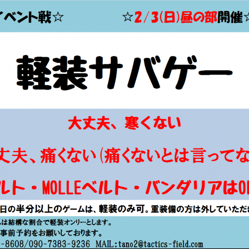 2019-02-03 ☆おはようございます☆本日のエントリー状況☆今日の一枚 おはようございます!さっそく本日のエントリー状況です。昼の部・・・40名様エントリー夜の部・・・エントリー無しとなっております。昼の部は軽装サバゲー!午前中のゲームに関しては、装備の縛りはしませんが(たぶん)、そこからは軽装で!具体的にはベルト装備・・・OKバンダリア・・・OKプレートキャリア・・・NGベスト・・・NGチェストリグ(ハーネス)・・・NGレッグパネル(ホルスター)・・・OKとなっております。その他ありましたら、スタッフに聞いてね!あ、恵方巻きは今年は東北東ですからね!スマホの磁石ア... (続きを読む)