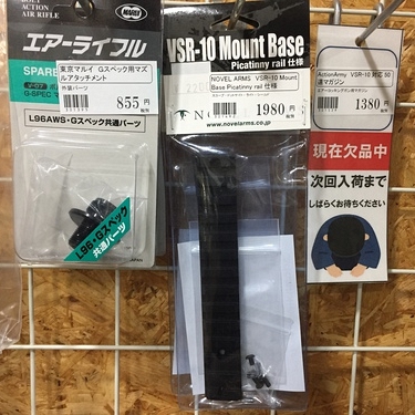 再入荷!NOVEL ARMS / VSR-10 Mount Base Picatinny rail仕様当店価格税抜1,980円ボルトアクションに手を出すとき、おそらく一番手を出しやすいであろうVSR-10ユーザーもおそらく一番多いかと思います。プロスナイパーの方は、レールは後付けですが、安くてプロポーションばっちり♪Gスペックはサプ付きレール付きスイベル付きとド安定のひと品。ただ、マルイ製VSR-10用レールはなぜあのつくりなんだ!!!なぜか20mmでない微妙な幅なぜか一部のマウントがはまらない...