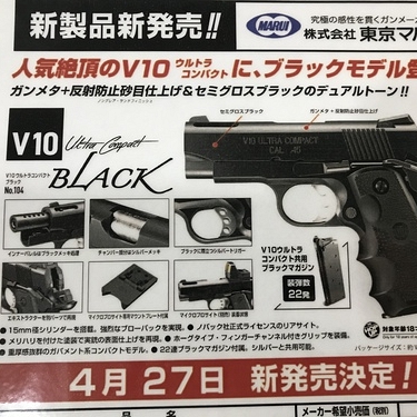マルイ新商品の紹介です!4/27(火)発売決定!東京マルイ / V10 ウルトラコンパクト BLACK税抜15,040円これももらっちゃいました♪どこかに飾らないとな~予約締切は4/14(水)までとなっております!!~基本スペック~・全長:180nmm・重量:709g・銃身長:74mm・装弾数:22発~特徴~・人気絶頂のV10にブラックモデル登場・直径15mmシリンダー搭載エンジン・コンパクトサイズながら強烈なブローバックを実現・重量感抜群のガバメント系コンパクトモデル・メリハリをつけた塗装で実...