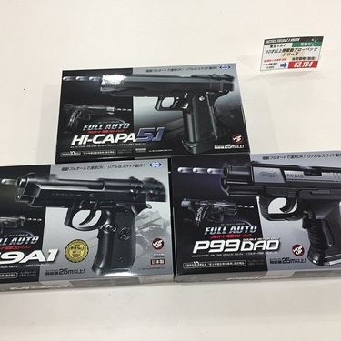 東京マルイの10才以上用電動ブローバックハンドガン入荷しております。P99DAOM9A1Hi-CAPA5.1それぞれ税抜3,184円すべてセミオートフルオート切り替え可となっておりますよ~18才以上用が買えないお子様はもちろん、大人が遊び用や対初心者用等使えるハンドガン!カションカションスライド動くのでかわいいですよ♪